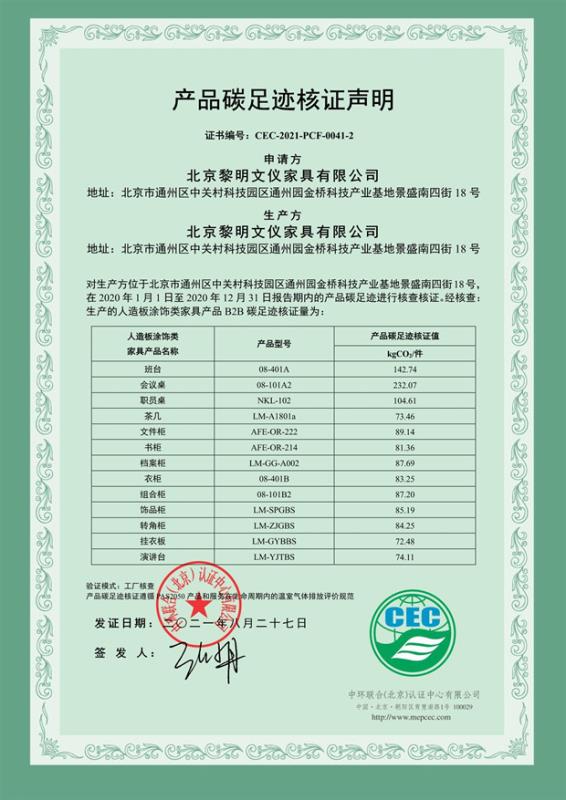 北京黎明文儀家具有限公司-產品碳足跡證書-CEC-2021-PCF-0041-2-人造板涂飾類家具