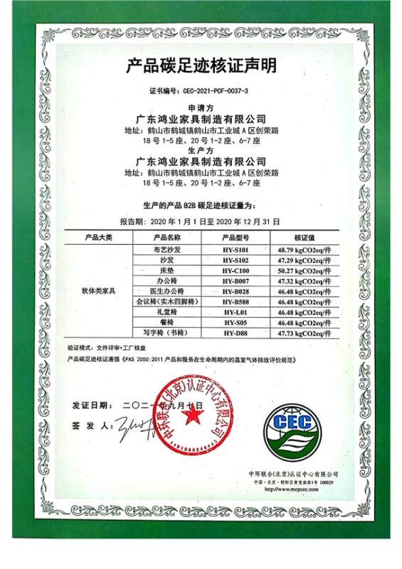 廣東省鴻業家具制造有限公司碳足跡核證聲明-CEC-2021-PCF-0037-3-軟體類家具