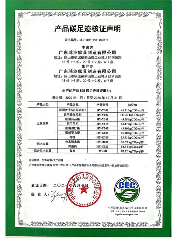 廣東省鴻業家具制造有限公司碳足跡核證聲明-CEC-2021-PCF-0037-2-金屬類鋼木類綜 合類木家具