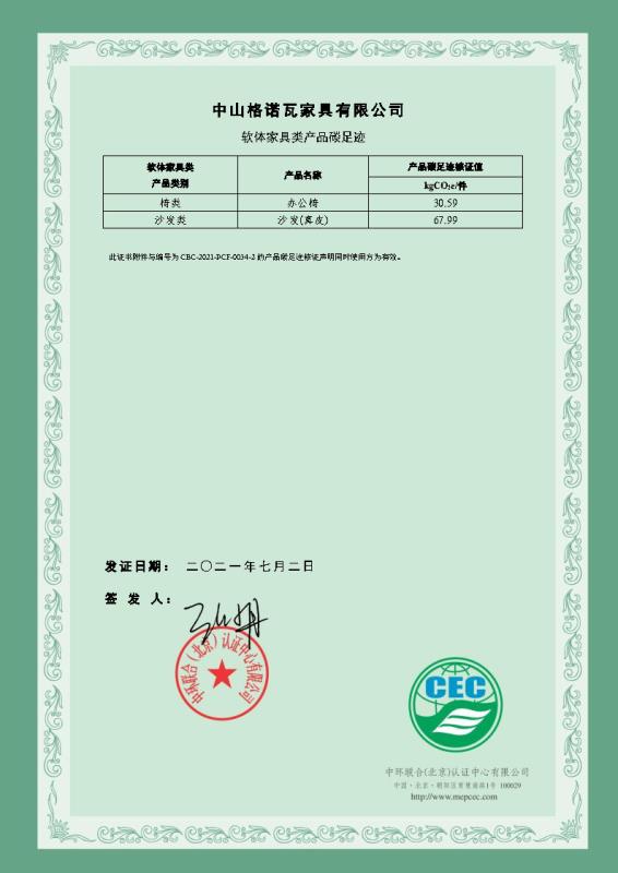 中山格諾瓦家具有限公司碳足跡核證聲明-CEC-2021-PCF-0034-2-軟體家具類