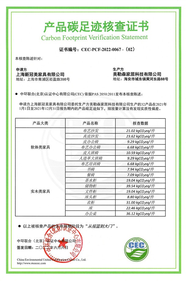 美勒森家居科技有限公司-CEC-PCF-2022-0067-(02)-軟體類家具+實木類家具
