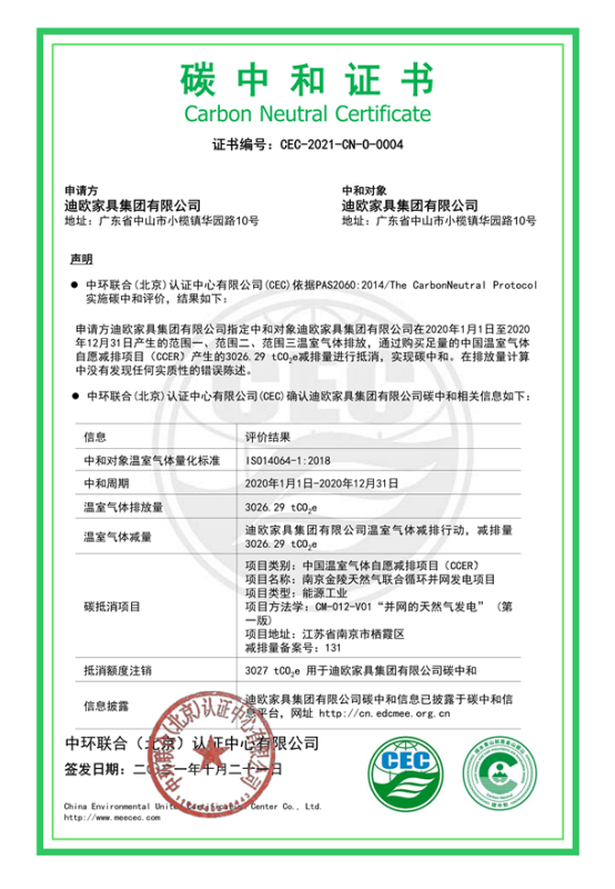 迪歐家具集團有限公司碳中和證書-CEC-2021-CN-O-0004