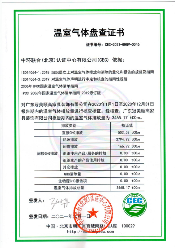 廣東冠美頤高家具裝飾有限公司-CEC-2021-GHGV-0046-溫室氣體盤查證書
