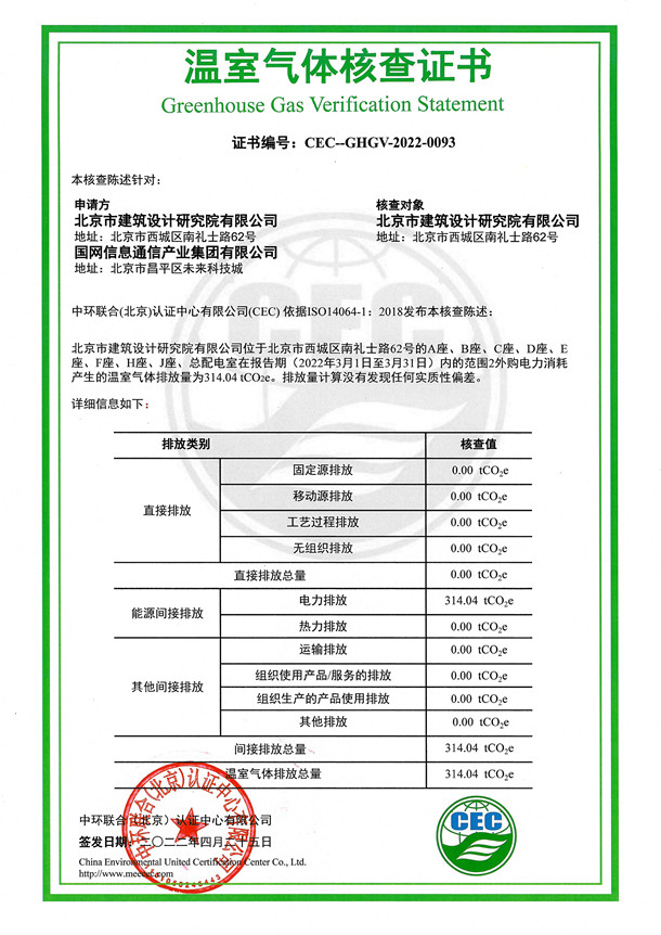 北京市建筑設計研究院有限公司-CEC-GHGV-2022-0093-溫室氣體核查證書