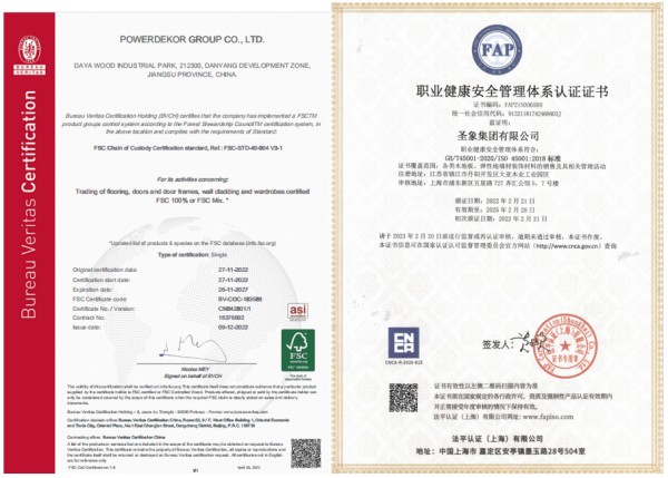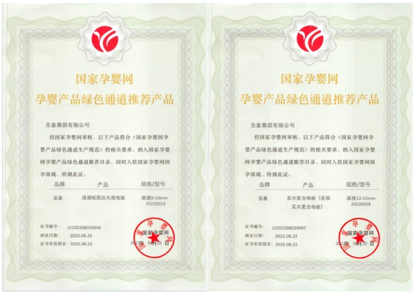 圣象集團及所屬工廠先后通過FSC森林認證、ISO9001質量管理體系、ISO14001環境管理體系、職業健康安全管理體系的認證,圣象產品獲得國家孕嬰網孕嬰產品綠色通道推薦產品、環境標志認證產品、綠色產品、綠色無醛添加型等證書。