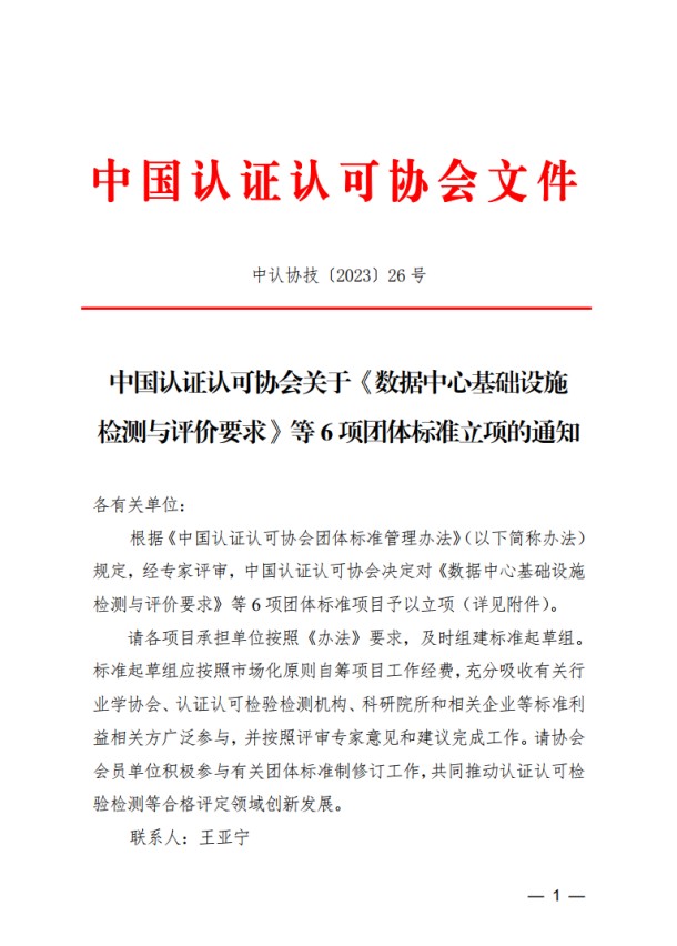 《中國認(rèn)證認(rèn)可協(xié)會關(guān)于<數(shù)據(jù)中心基礎(chǔ)設(shè)施檢測與評價要求>等6項團(tuán)體標(biāo)準(zhǔn)立項的通知》